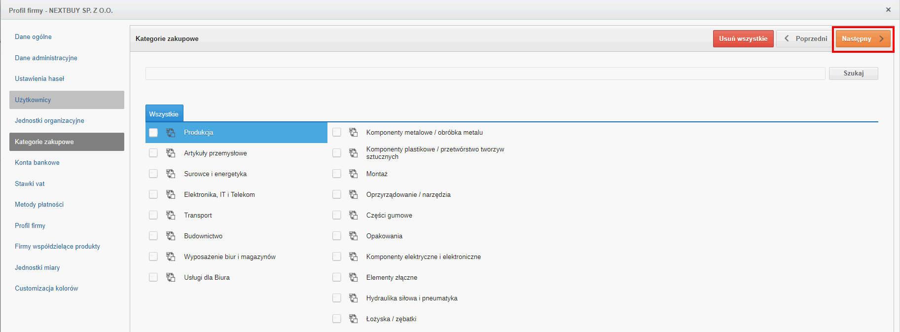 Aby przypisać kategorie zakupowe, należy wejść w zakładkę Profil firmy a następnie w zakładkę kategorie zakupowe, wybrać kategorię zakupową a następnie kliknąć przycisk Następny.