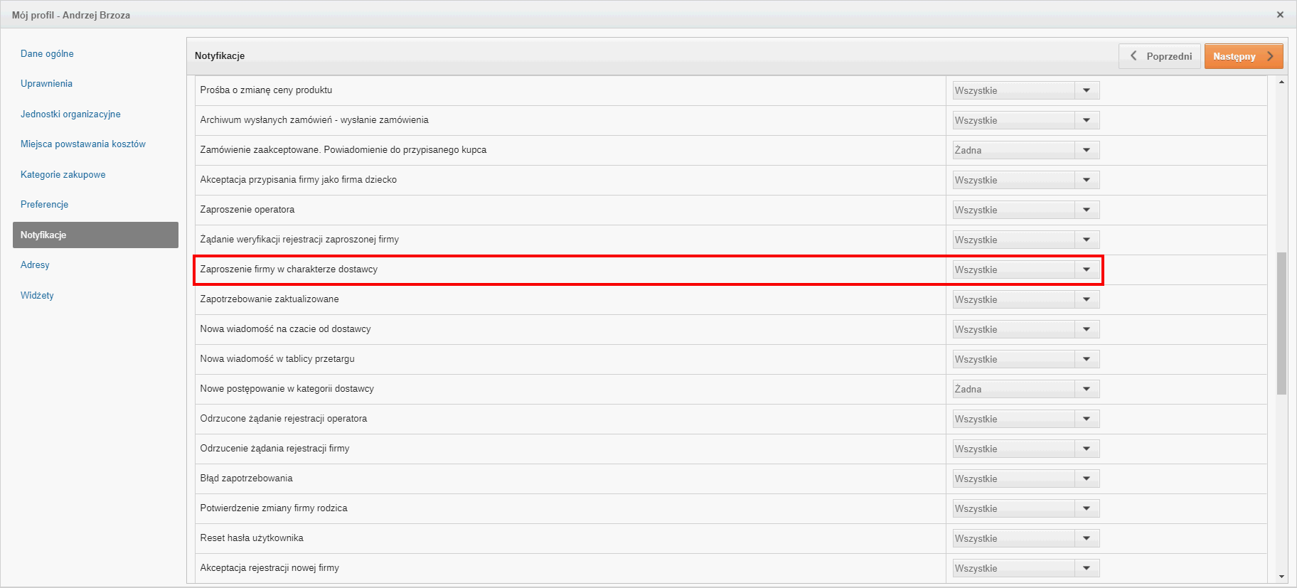 Aby włączyć powiadomienia o nowych postępowaniach, należy wejść w zakładkę Mój profil a następnie w zakładce Notyfikacje znaleźć Notyfikację o nazwie: Zaproszenie firmy w charakterze dostawcy