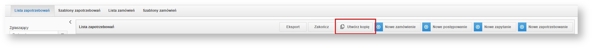 W przypadku konieczności utworzenia podobnego zapotrzebowania istnieje możliwość utworzenia kopii danego zapotrzebowania zaznaczając je na liście zapotrzebowań i klikając w przycisk utwórz kopię.