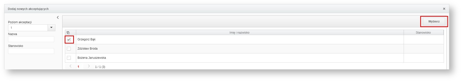 Zaznaczyć checkboxem dodatkowego akceptującego i kliknąć w przycisk wybierz