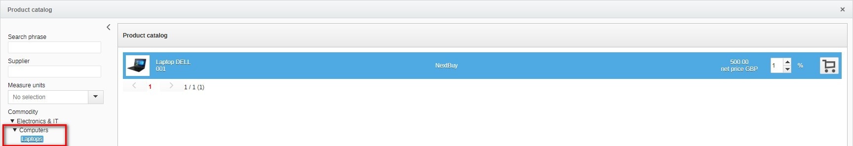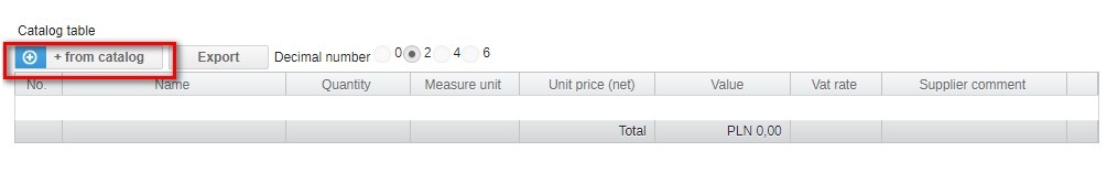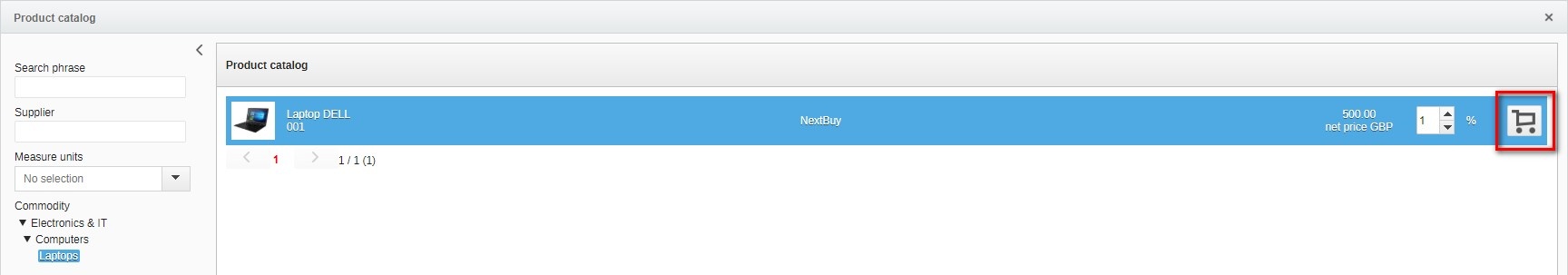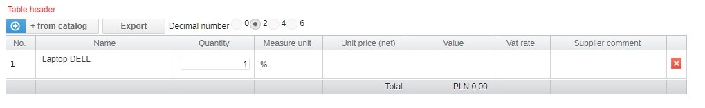 Clicking the cart button will complete the table with a ready item from the product catalog. You can still edit the quantity for which we will be asking.