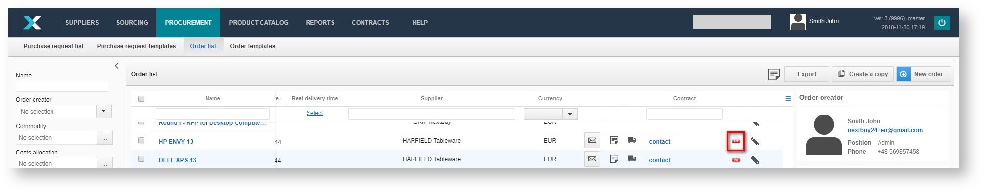 In the orders tab, clicking on the icon , we generate a file from a specific selected order in .pdf format
