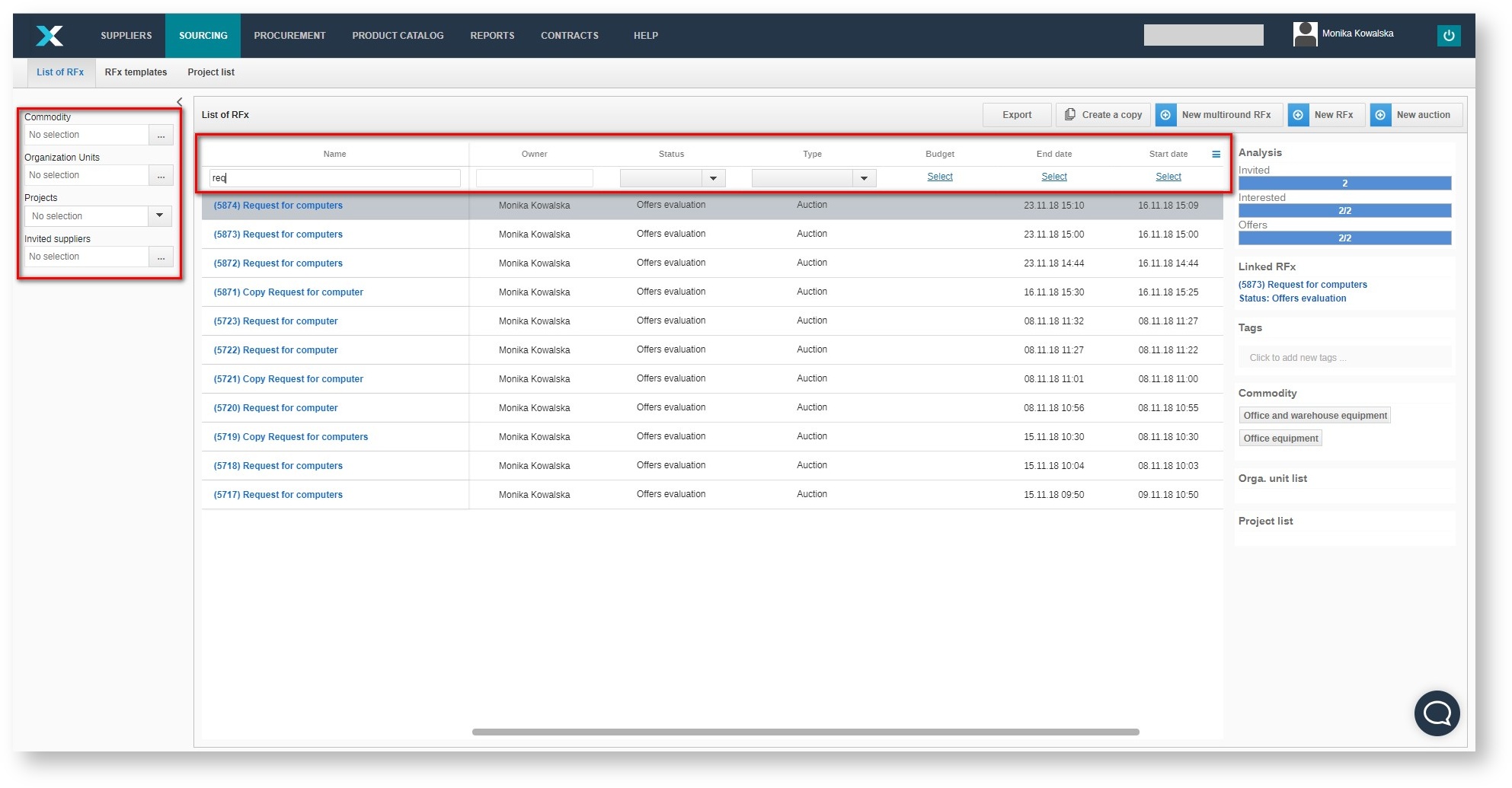 The NextBuy system allows you to search for auctions according to many available criteria. To do this, click on the RFx tab and a list of all available RFx will automatically appear. The system allows you to search and sort RFx thanks to the filters built into the tables. By default, auctions and RFx are sorted by the time they are created. At the beginning of the list, the newest auction / auction will appear.