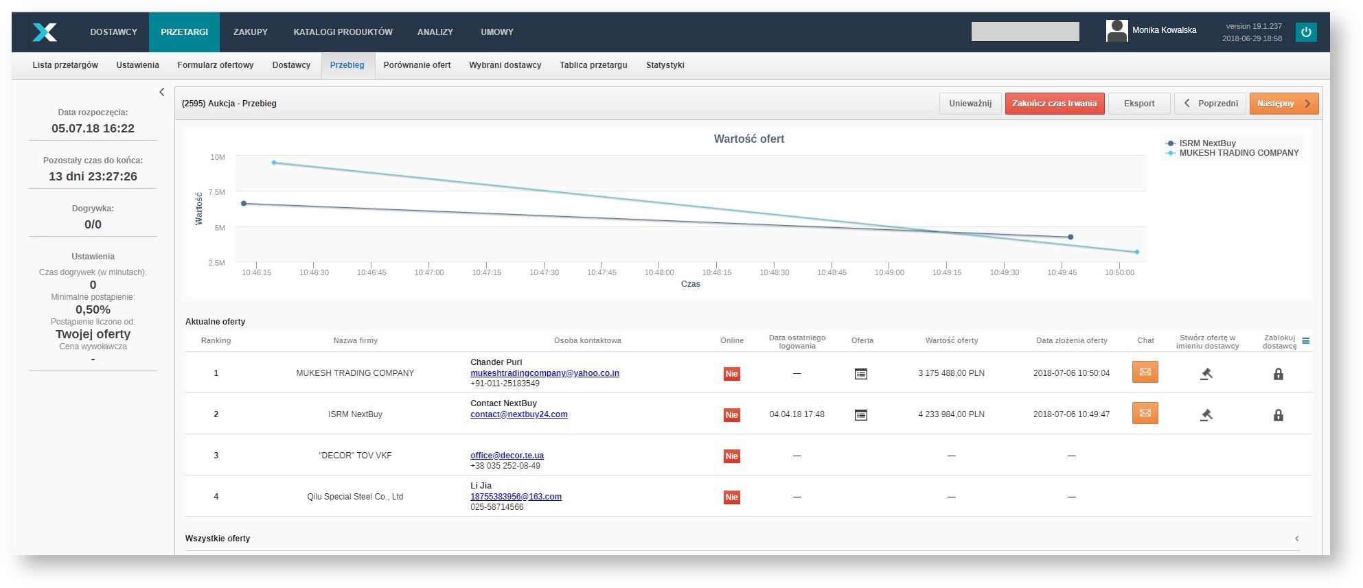 Zakładka ta pozwala śledzić na żywo składane przez dostawców oferty. Prezentowane są one na wykresie, widoczny jest także aktualny ranking ofert. Klikając dany punkt na wykresie zostanie wyświetlona informacja z dokładną ofertą. Istnieje możliwość odznaczenia danego dostawcy by nie widział wykresu. Dodatkowo możliwe jest przeglądanie całej historii składanych ofert a także wyeksportowanie przebiegu oferty do pliku Excel.