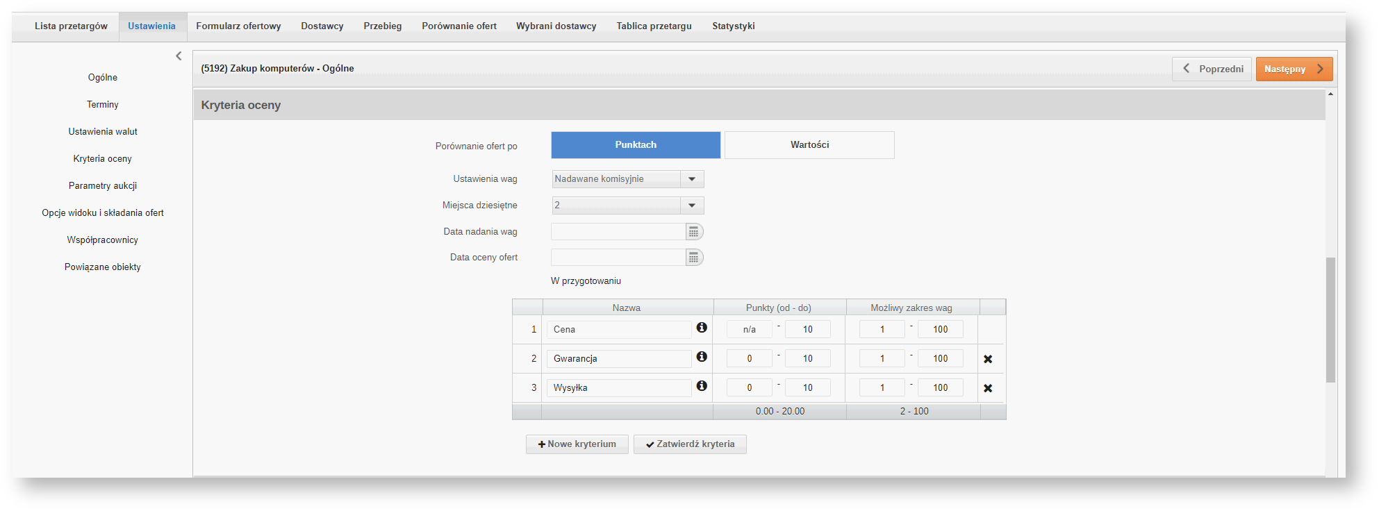 Następnie należy wybrać porównanie ofert po punktach oraz ustawienie wag Nadawane komisyjnie
