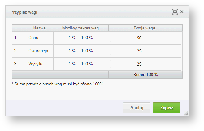 Aby móc przypisać wagi, należy najpierw zatwierdzić kryteria po czym kliknąć Przypisz wagi. Łączna suma wag musi wynosić 100%. Po wpisaniu wartości w każdej linii, należy kliknąć przycisk Zapisz.
