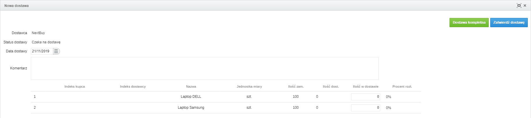 Po wciśnięciu przycisku Nowa dostawa, kupujący ma możliwość określenia daty dostawy, dodania komentarza jak również ilości dostarczonych produktów. Ponadto może zapisać aktualny stan klikając przycisk Zatwierdź dostawę.