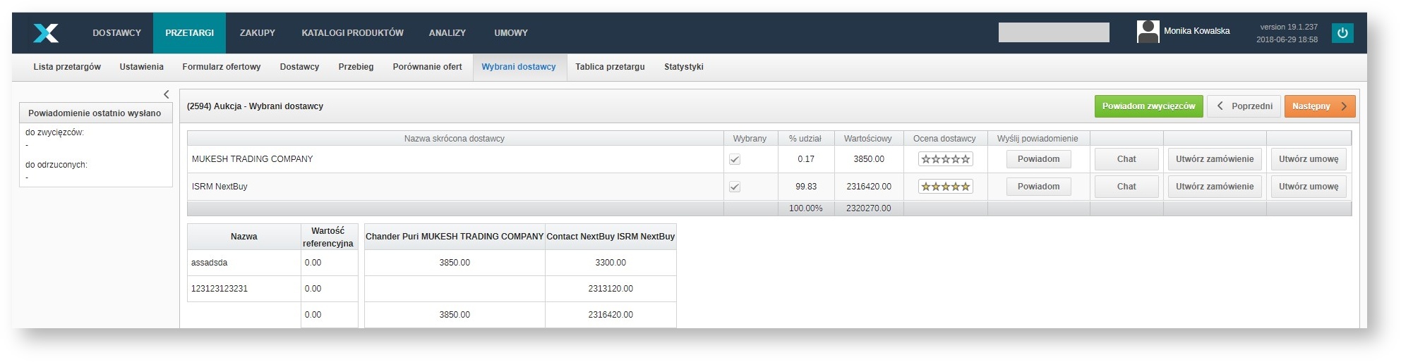 Zakładka ta wyświetla podsumowanie wyboru jaki został wcześniej dokonany. Wyszczególnieni są dostawcy, których oferty zostały wybrane. Widoczne są informacje odnośnie udziału procentowego oraz wartościowego dostawców. Kliknięcie przycisku powiadom odrzuconych spowoduje poinformowanie wszystkich dostawców o odrzuceniu ich oferty, natomiast przycisk powiadom zwycięzców pozwala powiadomić wszystkich wybranych dostawców. Klikając przycisk utwórz zamówienie można od razu złożyć Podręcznik użytkownika – e-aukcje Platforma zakupowa NextBuy – Ułatwiamy zakupy w twojej firmie str. 25 zamówienie do dostawcy. Opcja utwórz umowę możliwa jest tylko dla dostawców zarejestrowanych w platformie NextBuy.