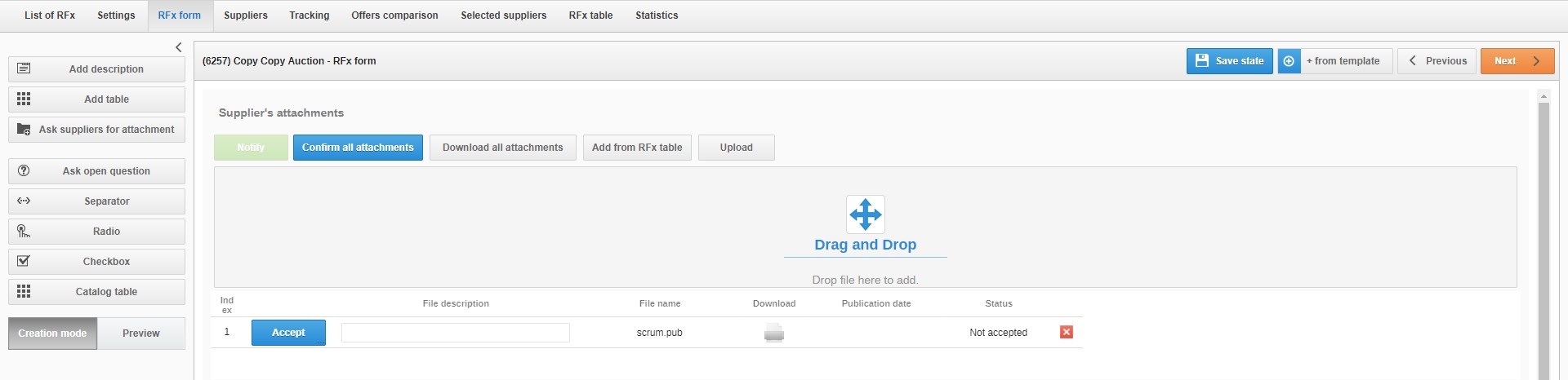You can add files by dragging them from the folder on your computer to the appropriate place of the so-called application. Drag and drop or use the button to add attachments from the tender table from among the files placed there. Each file must be confirmed with the confirm button. Files with status unapproved and deleted will not be visible to suppliers.
