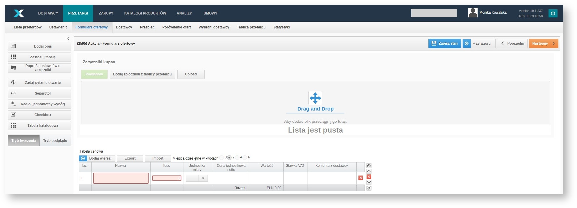 Tabele należy dodać klikając przycisk zastosuj tabelę, pojawi się ona pusta z jednym wierszem. Możną ją edytować w następujący sposób: