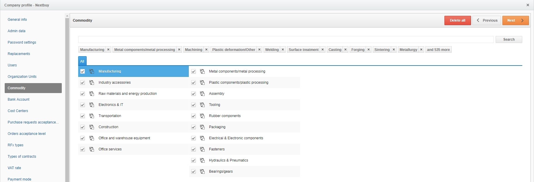 To assign shopping categories, go to the Company profile tab and then in the commodity tab, select the purchase category and then click the Next button.