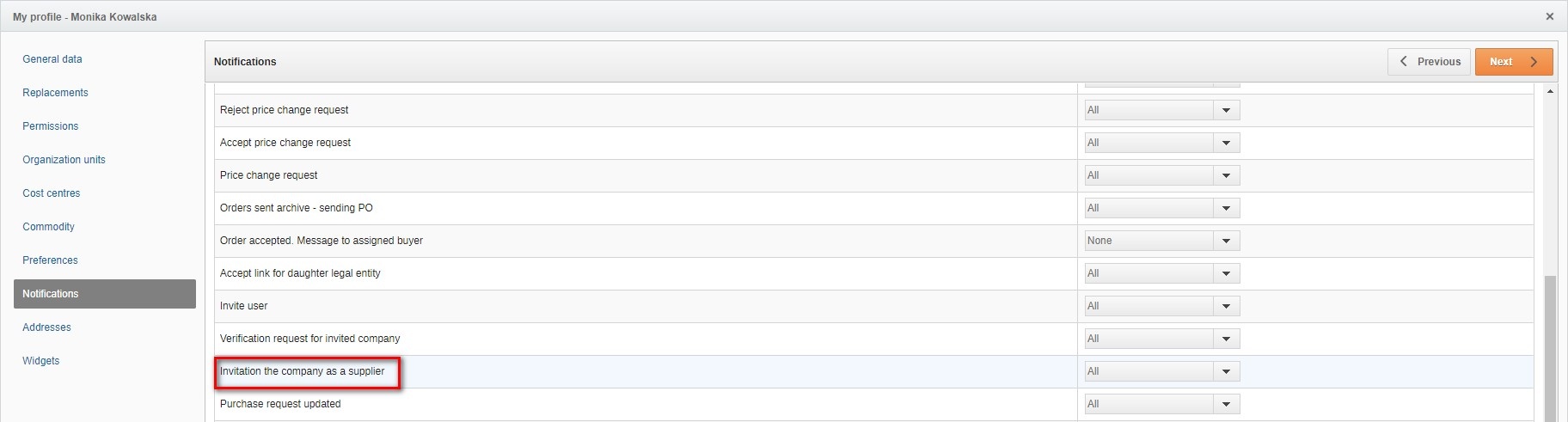To enable notifications about new proceedings, go to the My profile tab and then in the Notifications tab, find the Notification named: Invitation the company as a supplier