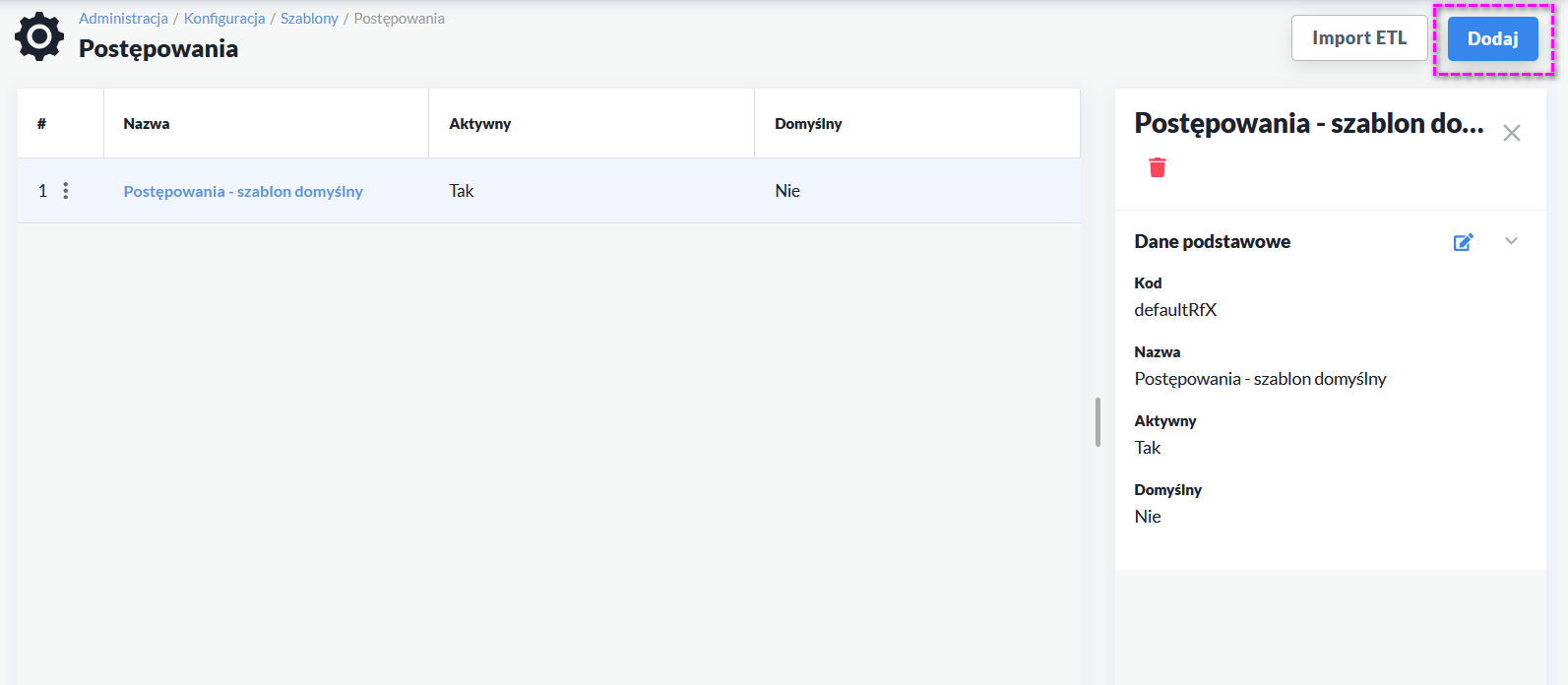 - Domyślny - TAK/NIE. W systemie może być dostępnych wiele szablonów, ale tylko jeden może mieć ustawiony parametr Domyślny: TAK. Ustawienie tego parametru powoduje, że szablon jest domyślnie wczytywany na nowo utworzoną rundę w danym postępowaniu.